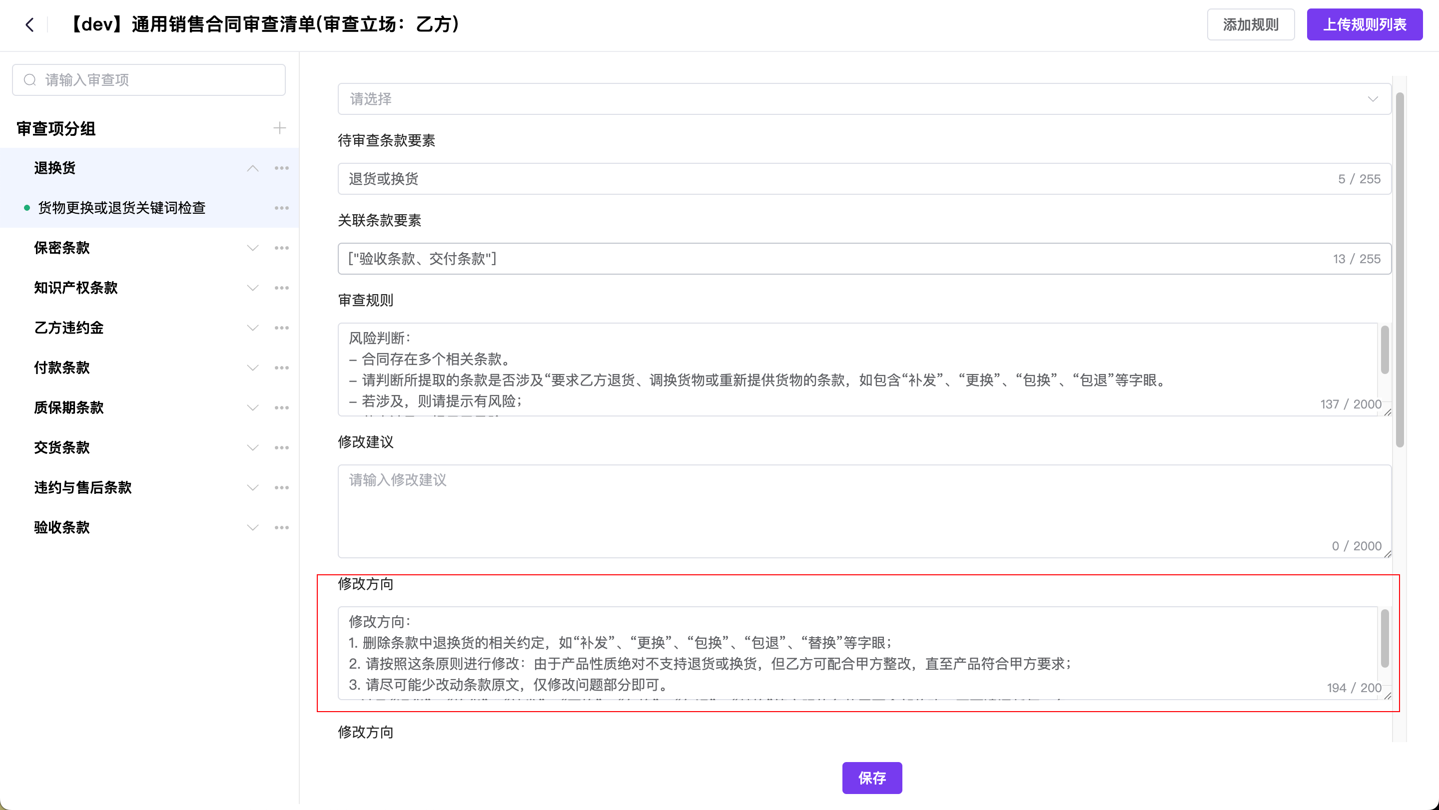 审查清单添加“修改方向”字段,支持预先配置指导大模型输出“修改建议”的提示词,从而提升审查结果中“修改建议”的实用性,提升用户对审查结果的采纳率。