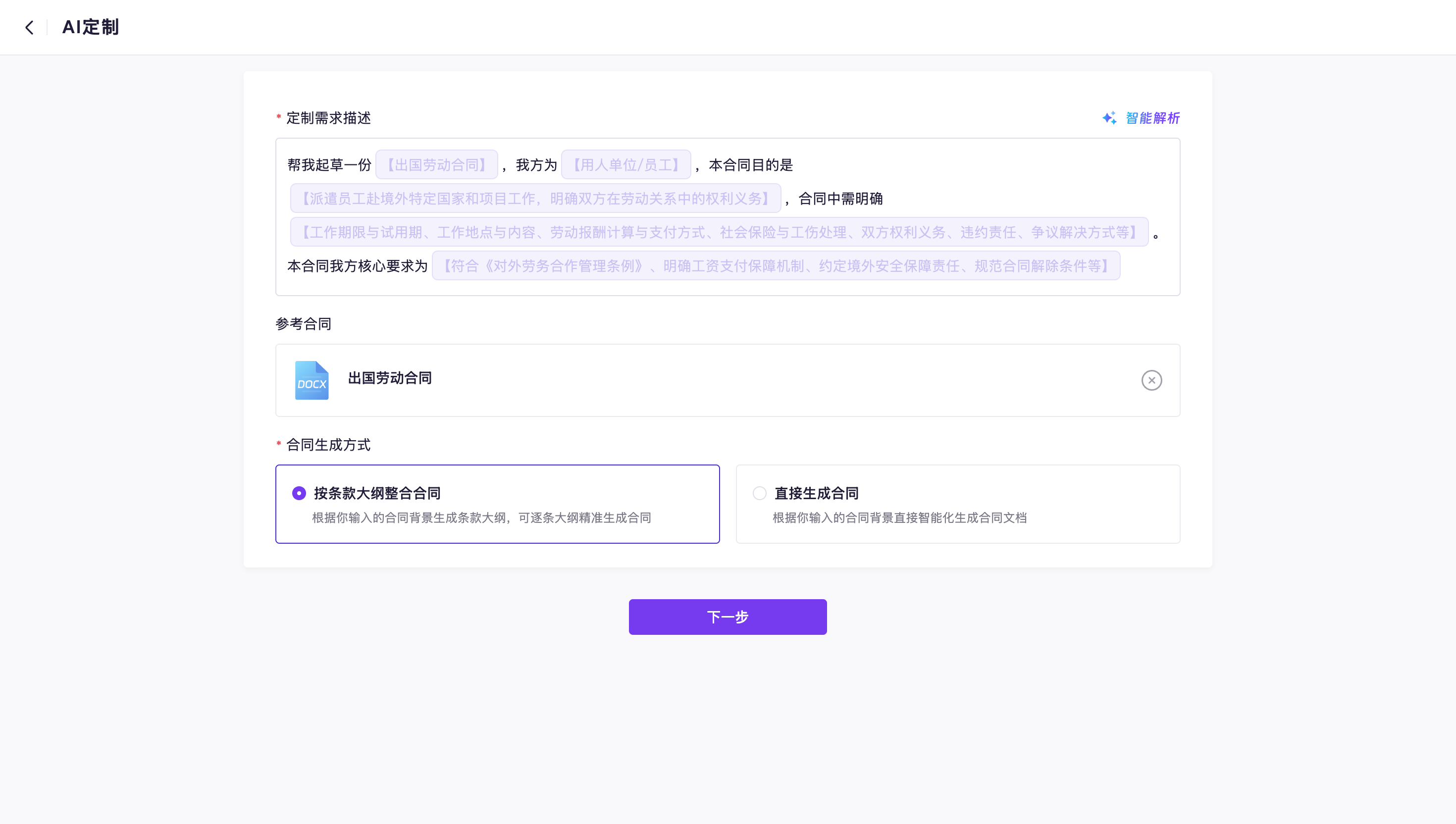 在合同起草的输入框内新增合同主要内容、权利义务、需要特别强调的条款的填词槽,引导用户填写合同起草所需信息;点击AI一键优化,将客户用非正式、口语化方式描述的情况,提炼并改写成一段可用于正式法律文书的、格式化的、中立且有条理的“背景与目的”陈述。