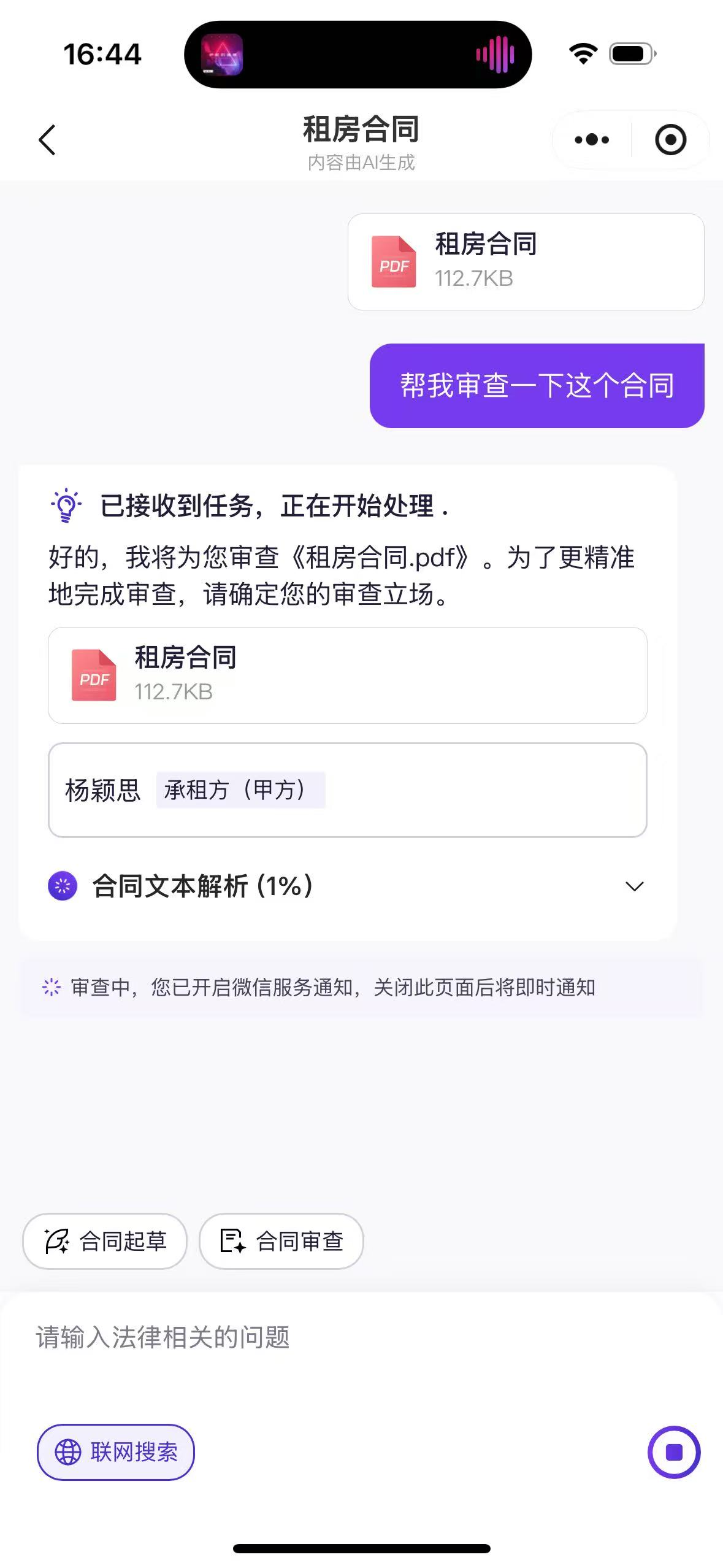 2、【优化】合同审查支持后台运行,审查完成发送小程序通知