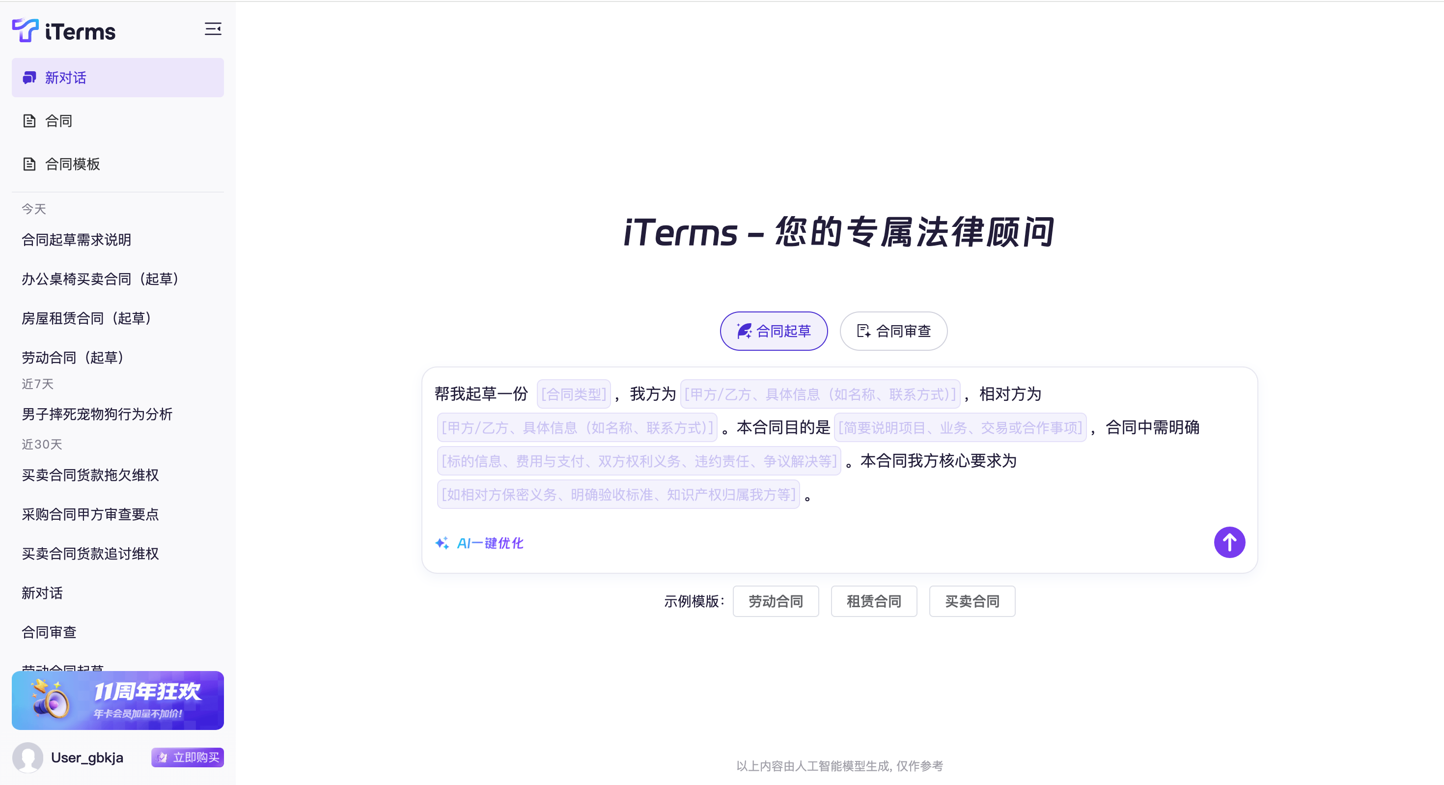 2.AI定制:区别于传统通用大模型,iTerms 提供基于合同模板生成“填词槽”填写指引,引导用户按照“填词槽”梳理合同需求 。用户输入关键信息后,AI 可提取合同名称、合同类型、合同立场等,并进行结构化内容整理,快速生成符合业务需求的合同草稿,实现基于模板的“一键优化”和定制起草 。