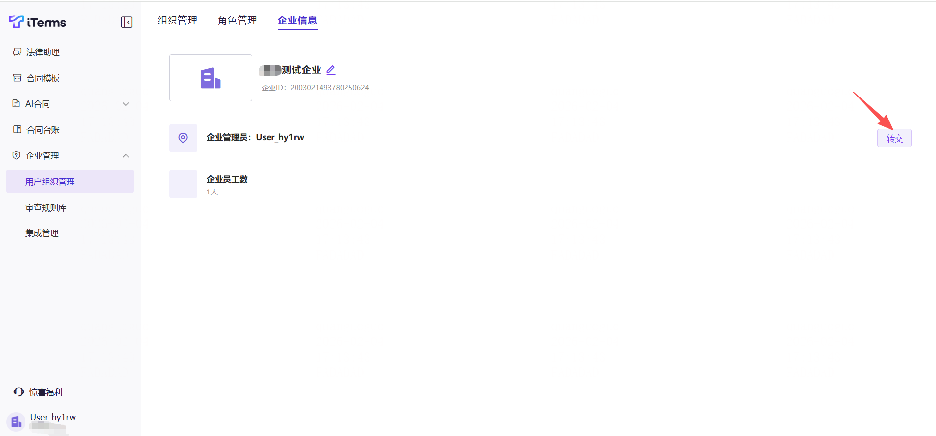 1)点击侧边栏的的【用户组织管理】,切换至“企业信息”,点击企业管理员右侧的"转交"按钮。