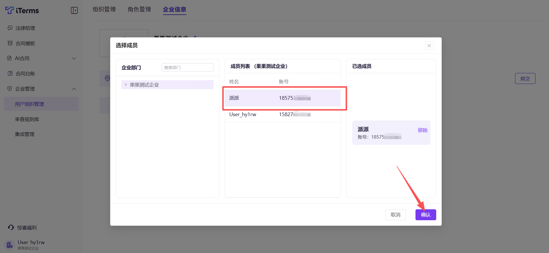 2)选择被转交的企业成员,点击确认即可。