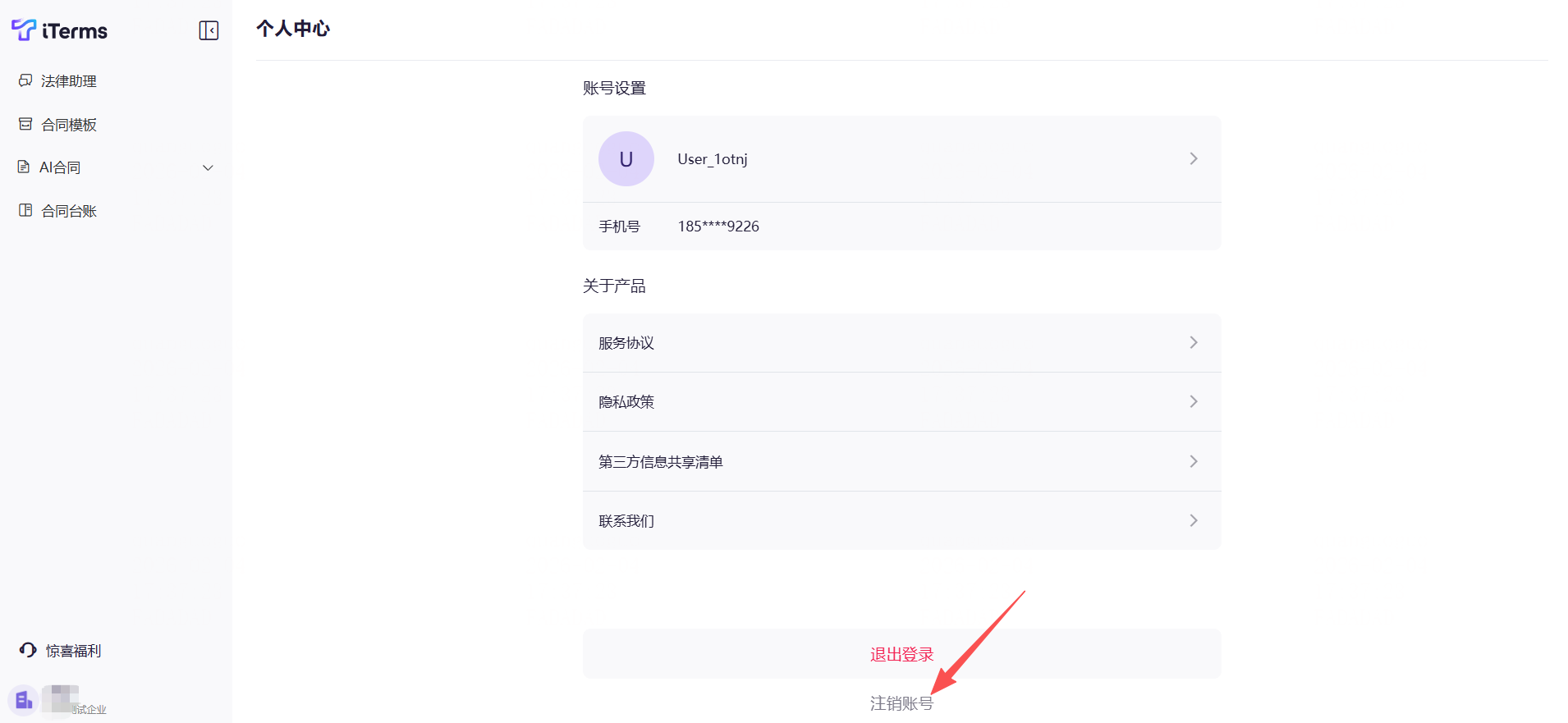 2)点击页面底部的"注销账号"。
